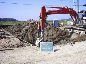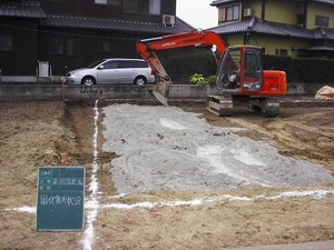 浅層混合処理工法は地盤の表層部分(2m程度まで)に軟弱層がある場合、セメント系固化材を紛体のまま散布し、それをバックホーにより現位置土と混合撹拌します。それをさらに転圧することによって一定の厚さの改良盤を作りあげます。それによって建築地盤の支持力向上を図ることができます。